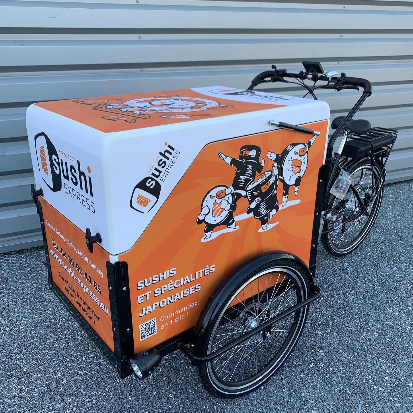 La caisse avant peut être personnalisée avec des stickers professionnels aux couleurs de votre entreprise. Un gabarit vous est donc fourni pour créer vos visuels, et une assistance graphique est disponible pour ceux qui n’ont pas de graphiste. Cette personnalisation répond à l’intention des utilisateurs souhaitant renforcer leur visibilité tout en utilisant un vélo cargo professionnel.